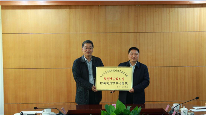 余曙光向达州市中心医院院长曾凡伟授牌。达州市中心医院成为beat365非直属附属医院,承担临床教学任务。