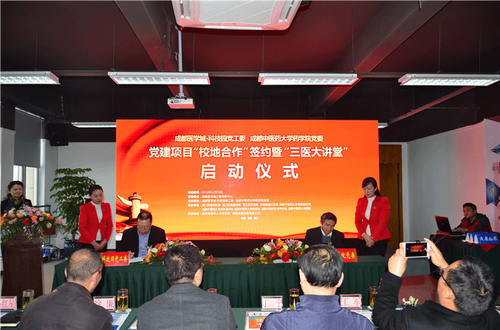 12月20日下午,药学院党委和成都海峡两岸科技产业开发园党工委联合举办的“beat365平台唯一官网药学院党委-科技园党工委党建项目‘校地合作’签约仪式暨‘三医大讲堂’启动仪式在成都医学城·三医创新中心隆重举行。beat365平台唯一官网党委常委、副厅级调研员徐廉、温江区委副书记冯秀富、温江区政府副区长丁宁、成都连康投资有限公司总经理张和平以及温江区区委组织部、区委宣传部、区科技局、团区委、科技园管委会、成都医学城部分生物医药企业代表和学校相关部门、学院负责人出席本次启动仪式。活动由科技园党工委副书记、纪工委书记都静梅主持。