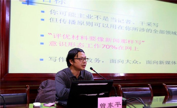 学校举行宣传工作业务培训会 发布时间:2016-12-22 10:05:00 浏览次数: 次 【字体:小 大】 12月21日下午,学校宣传工作业务培训会在温江校区行政楼第五会议室举行,四川日报《川报观察》客户端主编曾东平应邀为宣传部工作人员和学校全体宣传员作培训讲座。培训会由党委宣传部部长赖玉萍主持。 曾东平以自己长期在新闻工作第一线的经验为基础,以现代传播学理论为指导,结合大量生动贴近的案例,以新闻的特性和价值、新闻工作者的追求与素质、写好新闻的方法等论题为主要内容,并通过让大家修改稿件、选择图片等互动方式,为大家作了一场丰富精彩的新闻宣传业务培训。 (文/校报记者站 张宇 图/庞利红 编辑/刘承云) 【打印正文】 上一条:学校举行宣传工作业务培训会 下一条:beat365被评为成都市武术运动协会先进单位