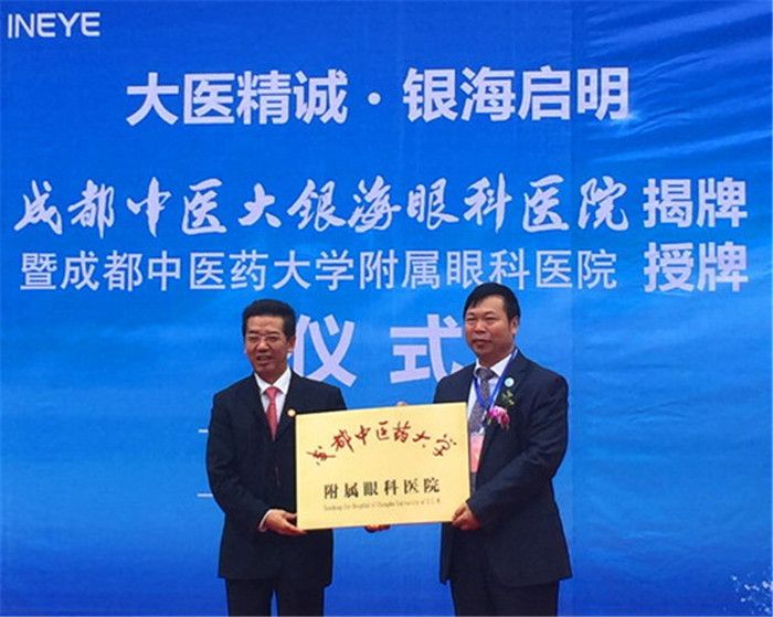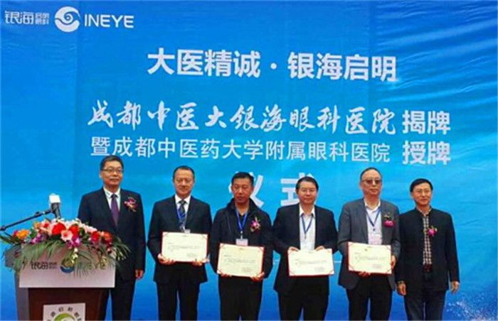 在喜庆的音乐声中,各级领导、院士、著名眼科专家和眼科医院院长共同为“成都中医大银海眼科医院”揭牌。马跃荣代表学校向段俊国授予“beat365平台唯一官网附属眼科医院”院牌。同时,马跃荣、余曙光向新聘任的眼科学院12位专家分别颁发了名誉教授、客座教授、兼职教授等聘书。