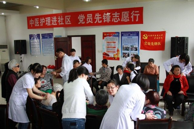 签约仪式后,学校医疗专家成员徐世军、张弛、黄金珠、余洁、徐侥、李天浩为社区居民开展现场义诊和医疗咨询服务;护理学院党员先锋队开展了为社区居民按摩、耳穴保健等中医护理服务,并现场教授日常保健操。