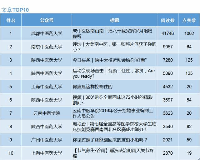 学校官方微信在全国中医药院校微信影响力周榜中位居首位(4.17-4.23) 发布时间:2016-04-28 13:49:00 浏览次数: 次 【字体:小 大】 由学校官方微信公众号推送的《成中医版南山南|把六十载光辉岁月唱给你听》秒杀其他高校文章,以4万多的阅读量傲视了中医药院校微信圈。 (编辑/任翔) 【打印正文】 上一条:学校召开“两学一做”学习教育工作座谈会 下一条:学校官方微信在全国中医药院校微信影响力周榜中位居首位(4.17-4.23)