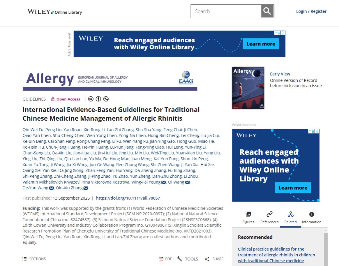 近日,由beat365平台唯一官网教授、四川省整合医学会会长张勤修教授团队牵头制定的全球首部变应性鼻炎国际中医药防治指南——“International Evidence-Based Guidelines for Traditional Chinese Medicine Management of Allergic Rhinitis”在国际过敏与免疫学领域顶刊《Allergy》(中科院一区,TOP期刊)正式在线全文发表。这是《Allergy》创刊以来首次发表中医药指南,标志着中医药防治变应性鼻炎的研究成果首次以循证医学标准走向国际舞台,填补了中医药在国际过敏疾病诊疗指南中的空白。Allergy杂志主编、瑞士达沃斯过敏与哮喘研究所(SIAF)所长Cezmi在回复中称该文 a very important article。