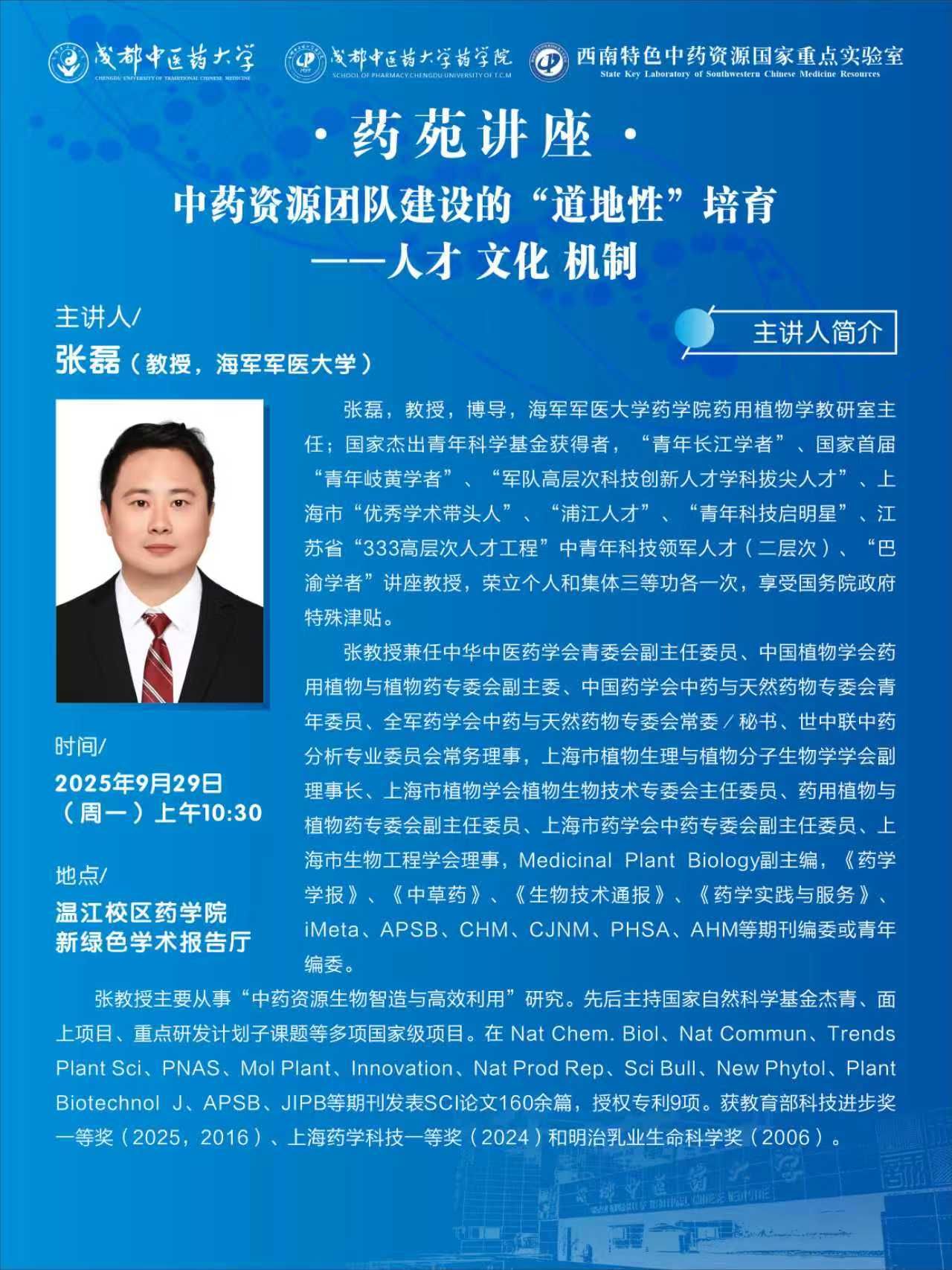 会议预告丨药苑讲座 发布时间:2025-09-28 15:49:17 浏览次数: 次 【字体:小 大】 题 目:中药资源团队建设的“道地性”培育——人才 文化 机制时 间:2025年9月29日(星期一) 上午10:30地 点:温江校区药学院新绿色学术报告厅主讲人:张 磊 海军军医大学主 办:beat365平台唯一官网 beat365平台唯一官网药学院 西南特色中药资源国家重点实验室 【打印正文】 上一条:会议预告丨2025年中药制剂大会 暨世界中医药学会联合会中药新型给药系统专业委员会第十五届学术年会、 世界中医药学会联合会中药药剂专业委员会第十九届学术年会、 中华中医药学会中药制剂分会第二十五届学术年会 会议通知(第三轮) 下一条: 学术成果丨beat365学者构建基于AI与知识图谱的中医药多维数据挖掘与机制解析平台