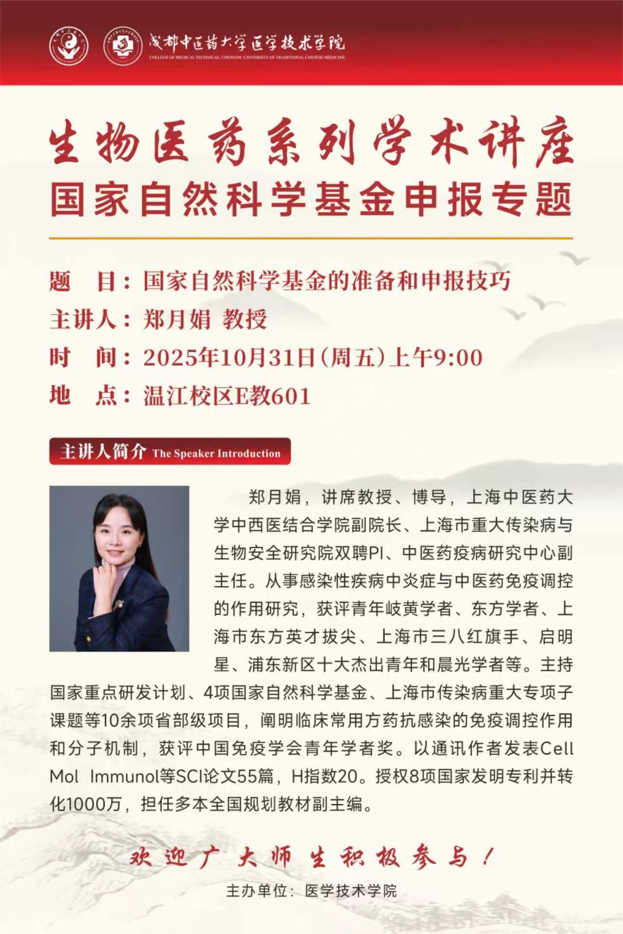 会议预告丨生物医药系列学术讲座 国家自然科学基金申报专题 发布时间:2025-10-31 08:37:44 浏览次数: 次 【字体:小 大】 题 目:国家自然科学基金的准备和申报技巧时 间:2025年10月31日(星期五) 上午09:00地 点:温江校区E教601主讲人:郑月娟 上海中医药大学主 办:医学技术学院 【打印正文】 上一条:会议预告丨名家名师名医学术讲座 beat365平台唯一官网2026年度国家自然科学基金申报科研思路与方法培训 下一条:会议预告丨名家名师名医学术讲座:器官芯片与药物研发