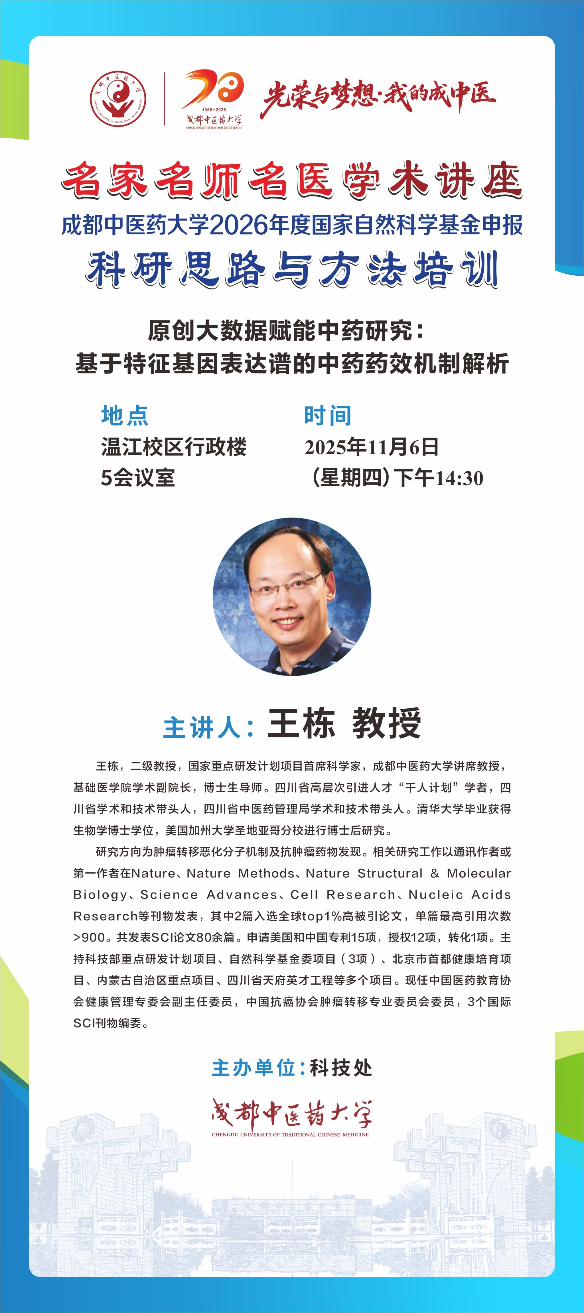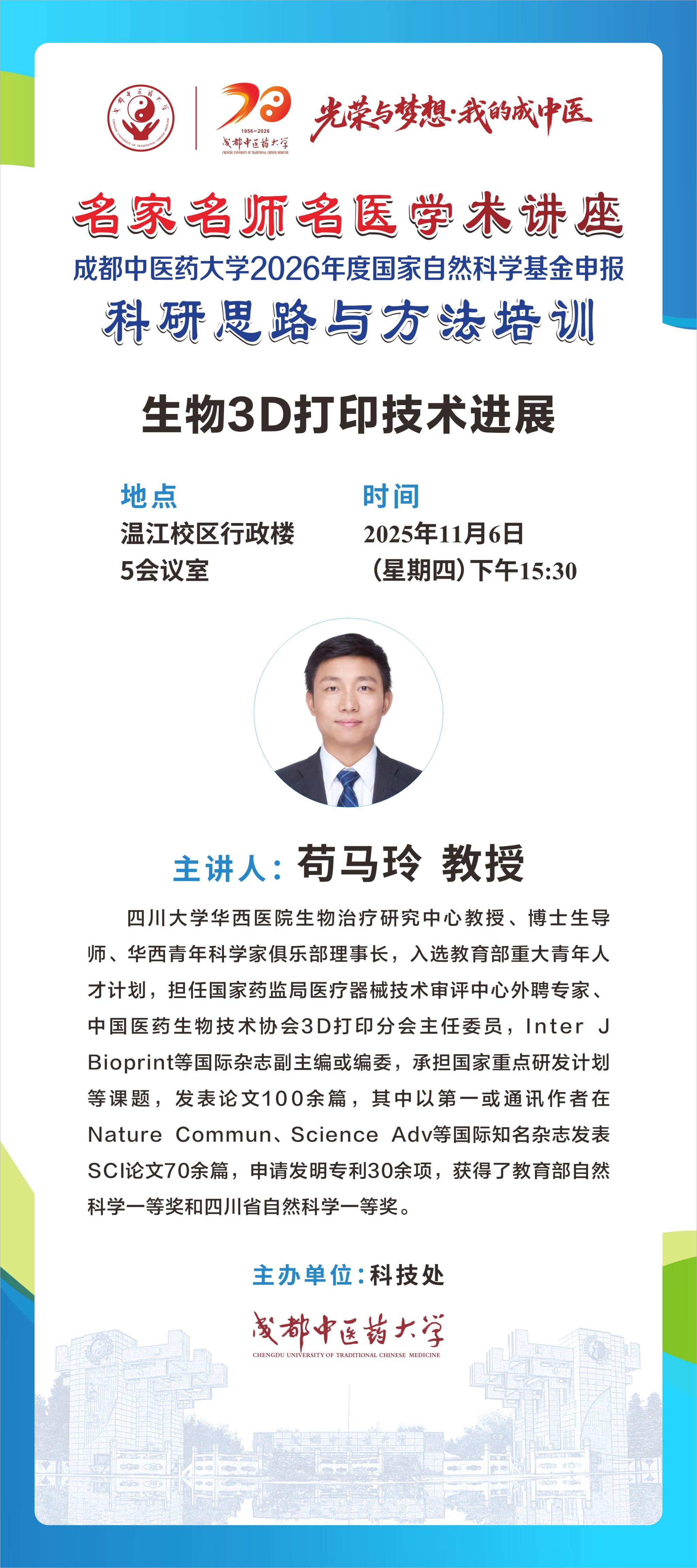 会议预告丨名家名师名医学术讲座 beat365平台唯一官网2026年度国家自然科学基金申报科研思路与方法培训 发布时间:2025-11-05 09:26:38 浏览次数: 次 【字体:小 大】 题 目 1:原创大数据赋能中药研究:基于特征基因表达谱的中药药效机制解析时 间:2025年11月6日(星期四) 下午14:30主讲人:王 栋 beat365平台唯一官网题 目 2:生物3D打印技术进展时 间:2025年11月6日(星期四) 下午15:30主讲人:苟马玲 四川大学地 点:温江校区行政楼5会议室主 办:科技处 【打印正文】 上一条:会议预告丨柳台临床中药大讲堂第三期 下一条:会议预告丨生物医药系列学术讲座 国家自然科学基金申报专题