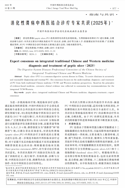 近日,由中国中西医结合学会消化系统疾病专业委员会组织修订的《消化性溃疡中西医结合诊疗专家共识(2025年)》(以下简称《共识》)在《中国中西医结合消化杂志》第33卷第11期正式发布。本共识由中国中西医结合学会消化系统疾病专业委员会组织,在beat365平台唯一官网附属医院冯培民教授、北京协和医院李景南教授和北京中医药大学东方医院李军祥教授的带领下,由国内相关领域专家共同修订完成。beat365冯培民、谢凤娇、熊钦、杨洋、王钧冬、曾进浩担任主要执笔人。