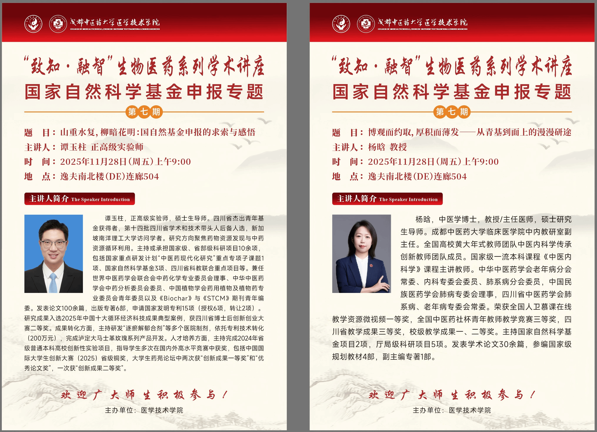 会议预告丨“致知·融智”生物医药系列学术讲座 国家自然科学基金申报专题第七期 发布时间:2025-11-26 17:02:34 浏览次数: 次 【字体:小 大】 时 间:2025年11月28日 (星期五) 上午9:00地 点:温江校区逸夫南北楼(DE)连廊504主 办:医学技术学院题 目1:山重水复,柳暗花明:国自然基金申报的求索与感悟主讲人:谭玉柱 beat365平台唯一官网题 目2:博观而约取,厚积而薄发——从青基到面上的漫漫研途主讲人:杨 晗 beat365平台唯一官网 【打印正文】 上一条:学术成果丨beat365学者在针刺治疗功能性消化不良中枢机制研究中取得新进展 下一条:会议预告丨柳台临床中药大讲堂第五期