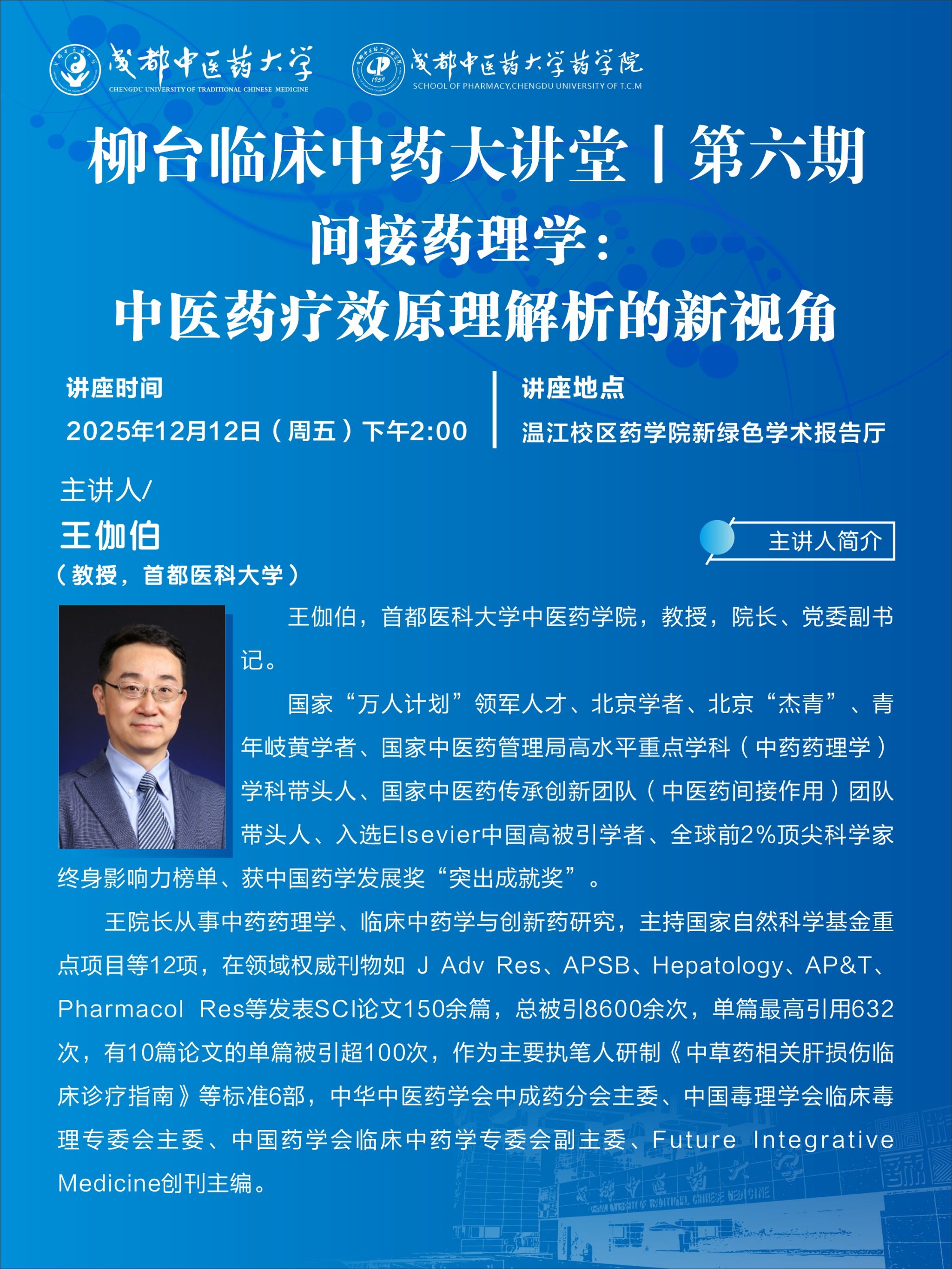 会议预告丨柳台临床中药大讲堂第六期 发布时间:2025-12-12 10:25:48 浏览次数: 次 【字体:小 大】 题 目:间接药理学:中医药疗效原理解析的新视角时 间:2025年12月12日(星期五) 下午14:00地 点:温江校区药学院新绿色学术报告厅主讲人:王伽伯 首都医科大学主 办:beat365平台唯一官网 beat365平台唯一官网药学院 【打印正文】 上一条:学术成果丨beat365学者在川芎水稻轮作内在机制解析系列研究中取得新进展 下一条:会议预告丨药苑讲座