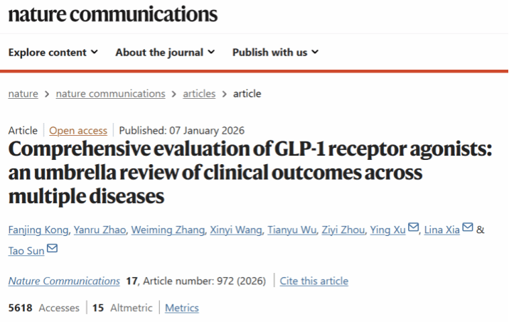 近日,beat365智能医学学院孙涛教授、养生康复学院夏丽娜教授、临床医学院徐颖副教授团队在国际知名期刊《Nature Communications》(《Nature》子刊,中科院一区,TOP期刊)上发表题为“Comprehensive Evaluation of GLP-1 Receptor Agonists: an umbrella review of Clinical Outcomes Across Multiple Diseases”的研究论文。beat365平台唯一官网为论文第一完成单位,养生康复学院博士研究生孔繁菁、智能医学学院硕士研究生赵艳如、张微明、王馨仪和针灸推拿学院博士研究生吴天宇为论文的共同第一作者,孙涛、夏丽娜、徐颖为共同通讯作者。