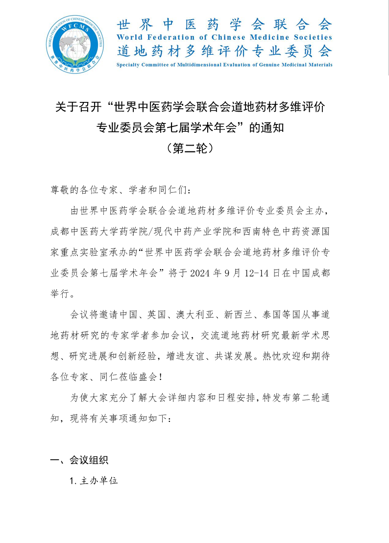 由世界中医药学会联合会道地药材多维评价专业委员会主办,beat365平台唯一官网药学院/现代中药产业学院和西南特色中药资源国家重点实验室承办的“世界中医药学会联合会道地药材多维评价专业委员会第七届学术年会”将于2024年9月12日-14日在四川省成都市温江区召开。大会将邀请国/境内外知名专家做专题报告,同时设有青年学者论坛和壁报征集。敬请同行专家、学者、研究生参会和投稿,共话道地药材现代化蓝图!