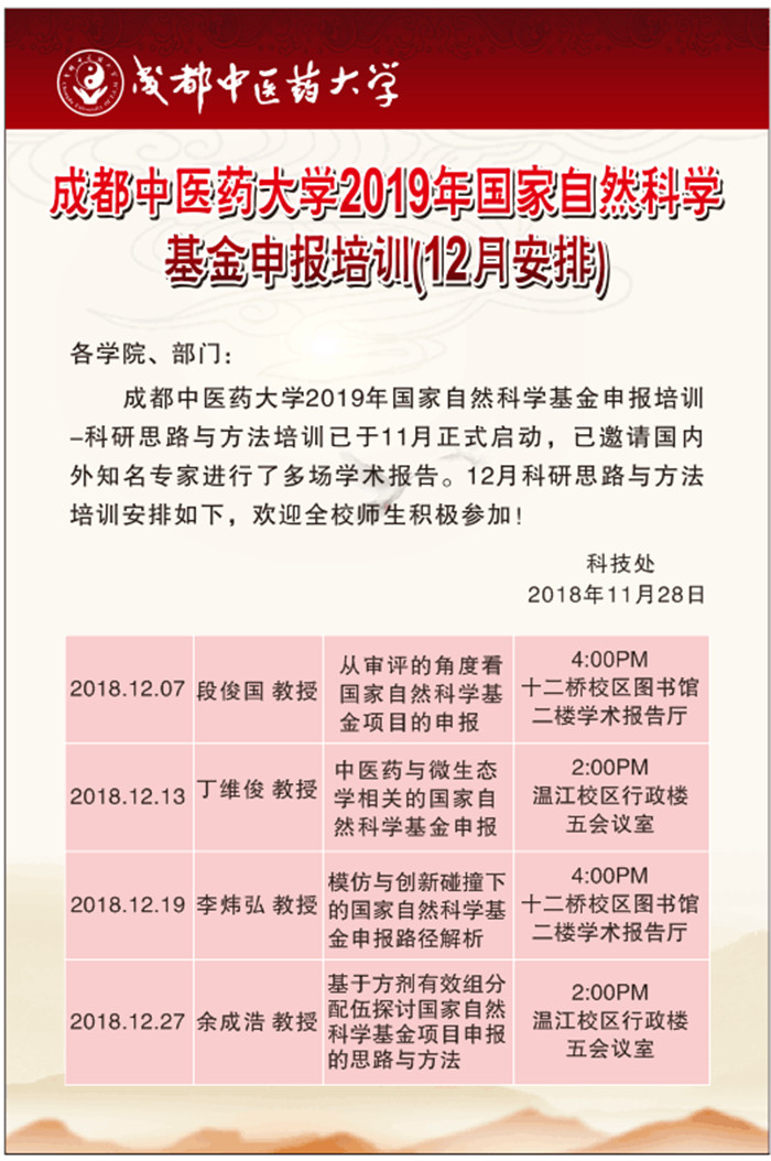 beat365平台唯一官网2019年国家自然科学基金申报培训(12月安排) 发布时间:2018-11-28 16:35:00 浏览次数: 次 【字体:小 大】 【打印正文】 上一条:beat365平台唯一官网2019年国家自然科学基金申报培训科学思路与方法培训 下一条:胡义扬教授应邀来beat365作国家自然基金选题及书写讲座