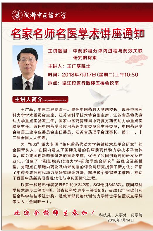 王广基院士讲座通知 发布时间:2018-07-16 10:46:00 浏览次数: 次 【字体:小 大】 【打印正文】 上一条:中国药科大学王广基院士来校作学术报告 下一条:法国迪卡尔大学Jessica ZUCMAN-ROSSI来校作学术报告
