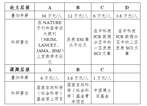 2.叠加年薪:在站期间,以beat365平台唯一官网为第一单位,博士后本人为负责人或第一作者,获得以下项目资助或发表论文者,可在原有年薪的基础上再提高相应的薪酬待遇,并从入站之日起补发(同一层级按就高不就低原则,不重复享受;论文层级可与课题层级叠加):