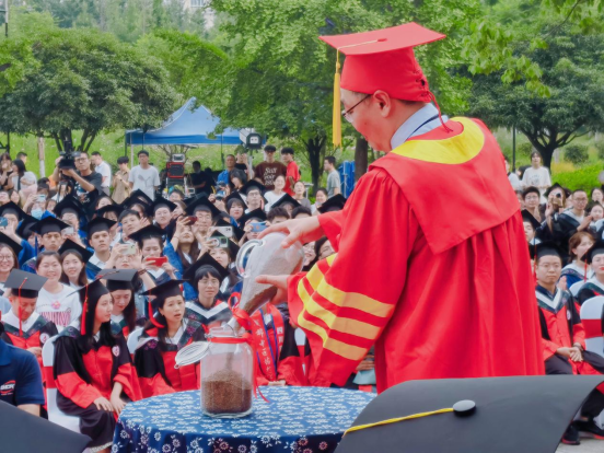现场,余曙光将种子倒入特制的中药种质资源保存瓶,现场封存作为纪念瓶,交予位于学校内的国家中药种质资源库永久保存。接着,他将一个个“远志祝福瓶”交由学校学位委员会成员,由教授们赠予2022届全体毕业生们。