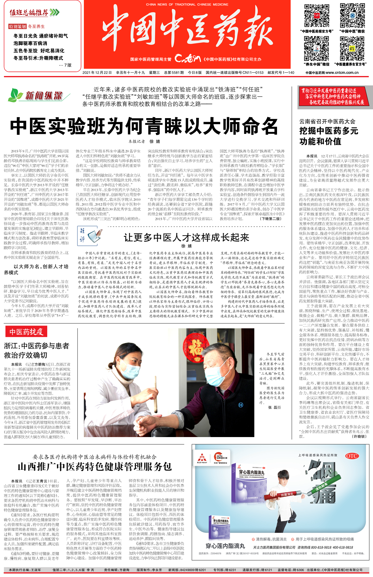 构建新时代中医药人才培养体系,让更多中医人才从中医实验班这样的培养环境中出发,在师承和院校教育的交融中健康快速成长起来,是“大师班”的意义所在。