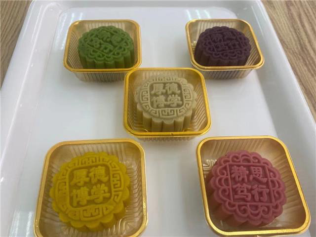 据了解,本次推出的月饼上都刻有校训文字"厚德博学"或"精思笃行"。其中一类月饼口感绵沙、细腻,工艺上改变了以小麦粉做月饼的传统,这一品类以《黄帝内经》中"五色有五味,五行入五脏"的中医理论为制作理念,烘焙五种口味。