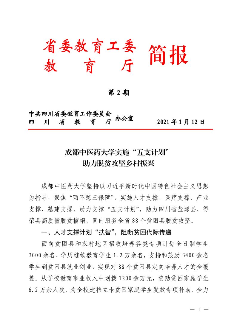 beat365平台唯一官网坚持以习近平新时代中国特色社会主义思想为指导,聚焦“两不愁三保障”,实施人才支撑、医疗支撑、产业支撑、基建支撑、动力支撑“五支计划”,助力四川省盐源县、得荣县高质量脱贫摘帽,同时服务全省88个贫困县脱贫攻坚。
