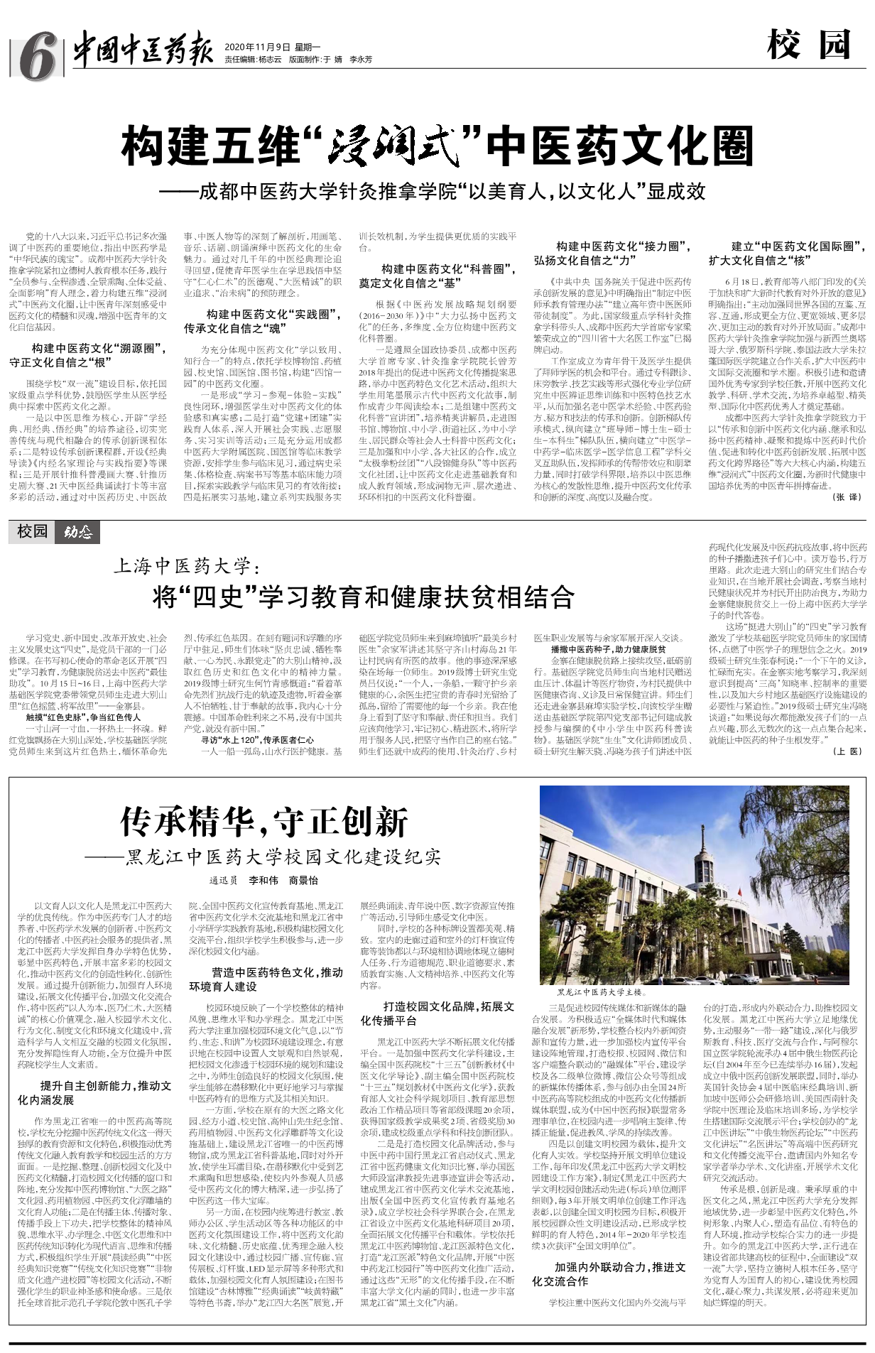 为充分体现中医药文化“学以致用、知行合一”的特点,依托学校博物馆、药植园、校史馆、国医馆、图书馆,构建“四馆一园”的中医药文化圈。