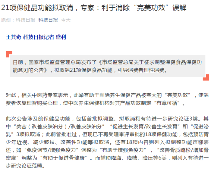 日前,国家市场监督管理总局发布了《市场监管总局关于征求调整保健食品保健功能意见的公告》,拟取消21项保健食品功能,引导消费者理性消费。