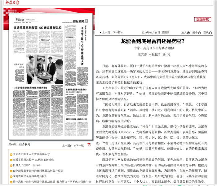日前,有媒体报道:厦门一男子在海边散步时拾得一块拳头大小味道腥臭的东西,经专家鉴定这竟是一块罕见的大宝贝——著名香料龙涎香。龙涎香到底是香料还是药材,如何分辨它?4月17日,beat365平台唯一官网药学院中药资源与鉴定系教授王光志接受了科技日报记者的采访。