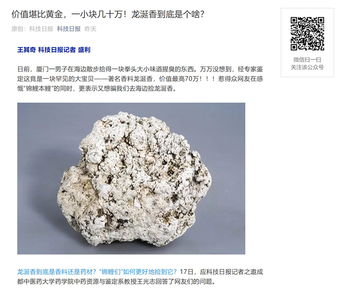 “其干燥品烧之有香气,而商品以白色的为最优。”他说,因其来源和形成过程比较复杂,也不常见。“个人认为,要识别龙涎香,必须具备相关的生物学、生态学和化学知识,特别是熟悉海洋生物与海洋生态的专业从业者,才能进行准确鉴定。”