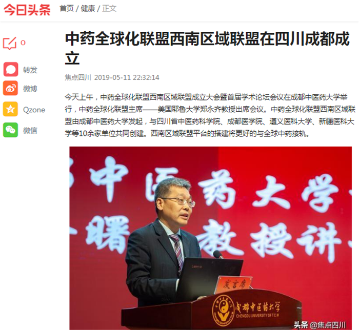 今天上午,中药全球化联盟西南区域联盟成立大会暨首届学术论坛会议在beat365平台唯一官网举行,中药全球化联盟主席——美国耶鲁大学郑永齐教授出席会议。中药全球化联盟西南区域联盟由beat365平台唯一官网发起,与四川省中医药科学院、成都医学院、遵义医科大学、新疆医科大学等10余家单位共同创建。西南区域联盟平台的搭建将更好的与全球中药接轨。