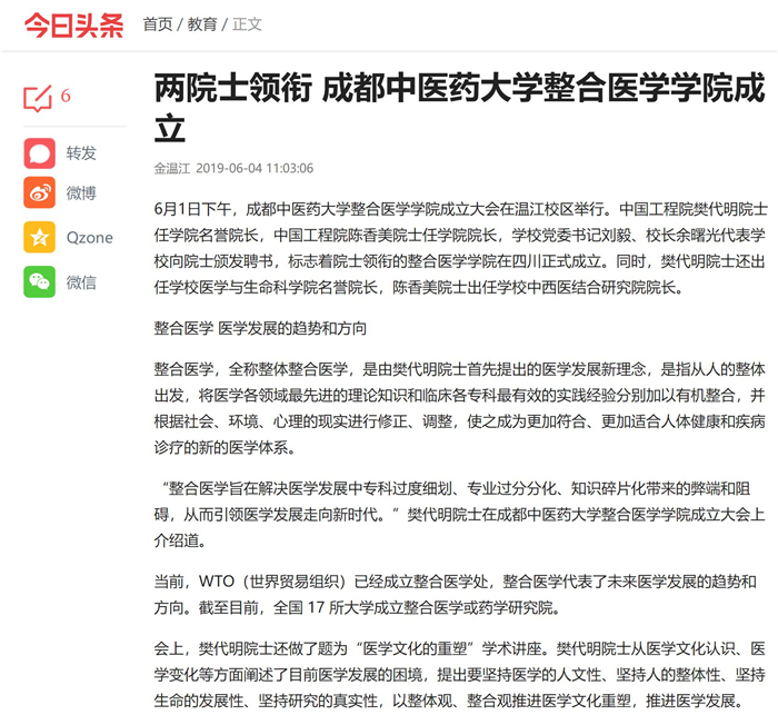 当前,WTO(世界贸易组织)已经成立整合医学处,整合医学代表了未来医学发展的趋势和方向。截至目前,全国 17 所大学成立整合医学或药学研究院。
