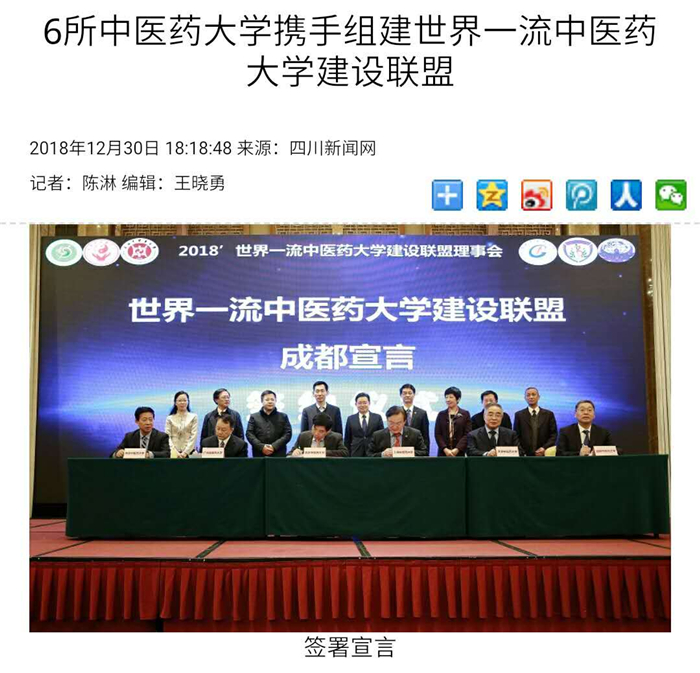 12月30日,2018世界一流中医药大学建设联盟理事会会议在成都召开。会上,来自北京中医药大学、上海中医药大学、广州中医药大学、南京中医药大学、天津中医药大学以及beat365平台唯一官网在成都组建世界一流中医药大学建设联盟,共同探索符合中医药特色和规律的一流大学与一流学科建设之路,为健康中国、文化强国建设贡献中医药力量。