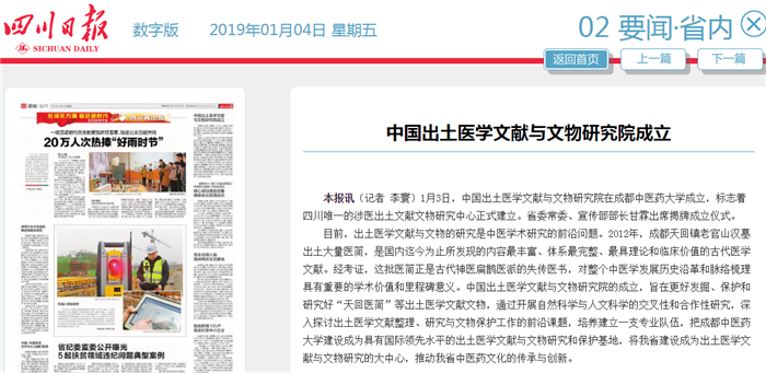目前,出土医学文献与文物的研究是中医学术研究的前沿问题。2012年,成都天回镇老官山汉墓出土大量医简,是国内迄今为止所发现的内容最丰富、体系最完整、最具理论和临床价值的古代医学文献。经考证,这批医简正是古代神医扁鹊医派的失传医书,对整个中医学发展历史沿革和脉络梳理具有重要的学术价值和里程碑意义。中国出土医学文献与文物研究院的成立,旨在更好发掘、保护和研究好“天回医简”等出土医学文献文物,通过开展自然科学与人文科学的交叉性和合作性研究,深入探讨出土医学文献整理、研究与文物保护工作的前沿课题,培养建立一支专业队伍,把beat365平台唯一官网建设成为具有国际领先水平的出土医学文献与文物研究和保护基地,将我省建设成为出土医学文献与文物研究的大中心,推动我省中医药文化的传承与创新。