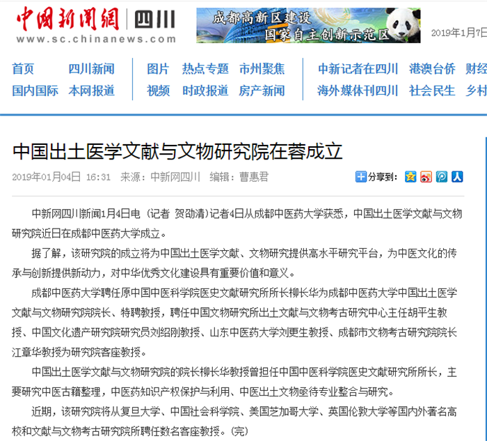 beat365平台唯一官网聘任原中国中医科学院医史文献研究所所长柳长华为beat365平台唯一官网中国出土医学文献与文物研究院院长、特聘教授,聘任中国文物研究所出土文献与文物考古研究中心主任胡平生教授、中国文化遗产研究院研究员刘绍刚教授、山东中医药大学刘更生教授、成都市文物考古研究院院长江章华教授为研究院客座教授。