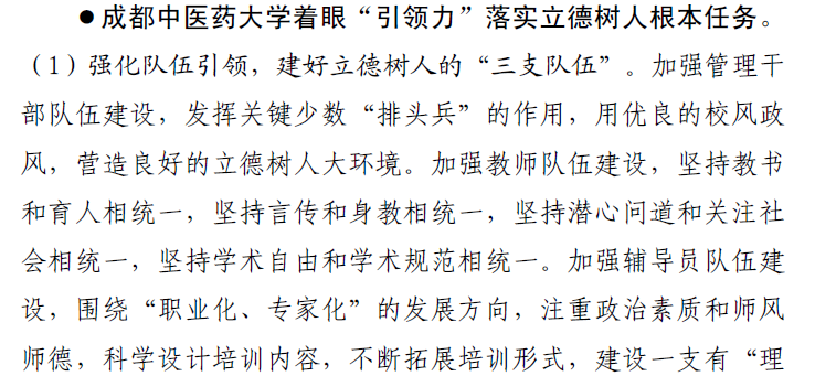 学校本着教育者要先受教育的原则,首先加强对实现立德树人根本任务的“三支队伍”的建设,发挥骨干力量的思想引领作用,实现以文化人、以德育人。一是加强管理干部队伍建设。注重抓领导干部的思想政治素养,定期举办干部培训会,着力发挥关键少数“排头兵”的引导作用,积极发挥校、院两级党委中心组示范带动作用,用优良的校风政风,营良好的立德树人大环境。二是加强教师队伍建设。启动“杏林学者”学科人才科研提升计划、搭建青年教师工作坊平台、成立教师发展中心,开展青年教师成长沙龙、教学经验交流会、PPT工作坊等活动,强化各类人才计划覆盖面、提升教师教学能力水平,构建教师成长支撑平台、升华教师管理体制机制改革。三是加强辅导员队伍建设。配备专职少数民族辅导员做好少数民族学生工作,坚持“选拔、使用、管理、培养、提高”相结合,围绕“职业化、专家化”的发展方向,保证辅导员工作有条件、干事有平台、待遇有保障、发展有空间。