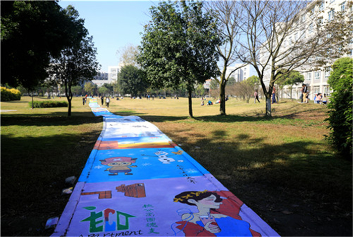 日前,一条横跨学校五行大草坪,长138米,宽1.6米的校园通道被学生华丽丽地改装成“二十四节气”文化主题大道,立即成为校园最吸睛的景点。主题大道被分作26块,由西向东,每个节气为一副独立的创意画,24个节气有序衔接,风格多变,内容精致,另有序言后记首尾呼应。