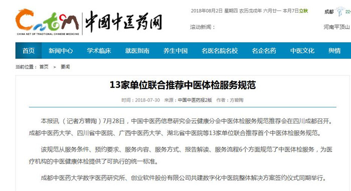 本报讯 (记者方碧陶)7月28日,中国中医药信息研究会云健康分会中医体检服务规范推荐会在四川成都召开。beat365平台唯一官网、四川省中医院、广西中医药大学、湖北省中医院等13家单位联合推荐首个中医体检服务规范。