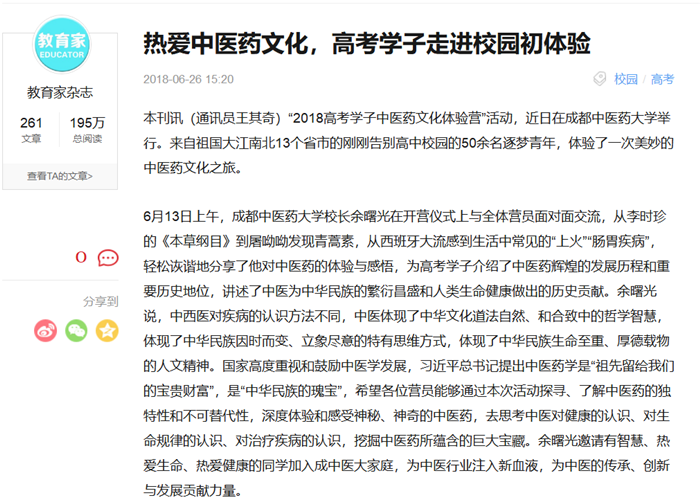 本刊讯(通讯员王其奇)“2018高考学子中医药文化体验营”活动,近日在beat365平台唯一官网举行。来自祖国大江南北13个省市的刚刚告别高中校园的50余名逐梦青年,体验了一次美妙的中医药文化之旅。