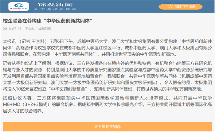 记者从签约仪式上了解到,根据协议,三方将发挥各自在境内外的优势和特色,有机整合与统筹三方在研究机构与专业人才的资源,特别是澳门大学的中药质量研究国家重点实验室与beat365平台唯一官网中药资源系统研究与开发,利用省部共建国家重点实验室培育基地加盟合作,强强联合,共建中华医药创新共同体(包括beat365平台唯一官网—太极创新研究院、澳门大学—太极中华医药创新研究院和重庆太极研究院)。令人振奋的是,太极集团将投入10亿元巨资设立“中华医药创新基金”,支持创新共同体建设,打造世界顶尖的中华医药创新高地。