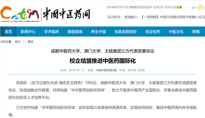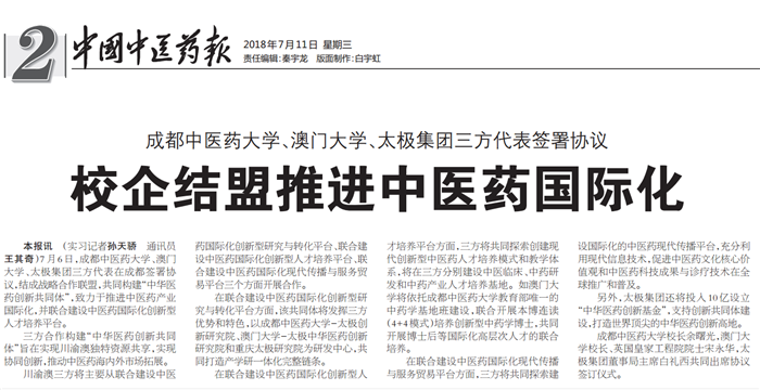 本报讯 (实习记者孙天骄 通讯员王其奇)7月6日,beat365平台唯一官网、澳门大学、太极集团三方代表在成都签署协议,结成战略合作联盟,共同构建“中华医药创新共同体”,致力于推进中医药产业国际化,并联合建设中医药国际化创新型人才培养平台。