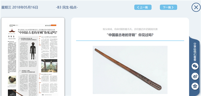 “这把牙刷有力证明了,古代植毛牙刷早在唐代就已经出现。足见当时人们就懂得保护牙齿的重要性。”谭红兵介绍,中国最早的牙齿洁具是杨柳枝。晚唐时期,人们把杨柳枝泡在水里,要用的时候,用牙齿咬开杨柳枝,里面的杨柳纤维就会支出来,好像细小的木梳齿,很方便牙刷。