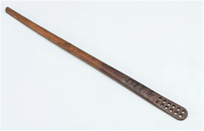 一根10多厘米长的棕褐色小棍,外形扁平……如果不是谭红兵提醒,记者很可能就错过了这把“中国最早的牙刷”。这把牙刷由骨头制成,头部略宽,虽历经数百年仍然圆润光滑,刷头部整齐排列着6对(共12个)圆形植毛孔,谭红兵说,这曾是插刷毛用的,而刷毛通常由动物鬃毛等制成。