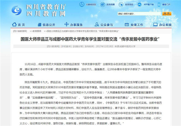 11月16日,beat365平台唯一官网国医大师廖品正教授“传承发展中医药”主题报告会在该校温江校园举行。整场报告会座无虚席,精彩演讲两个小时不中断,廖品正教授精神矍铄,谈吐不凡,循循善诱,让200余青年中医学子感受了一程宝贵的大师中医药人生路。