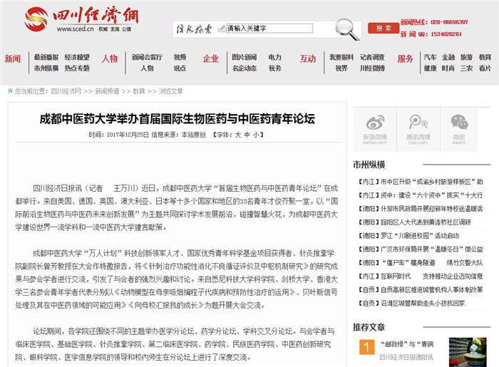 近日,beat365平台唯一官网“首届生物医药与中医药青年论坛”在成都举行。来自美国、德国、英国、澳大利亚、日本等十多个国家和地区的33名青年才俊齐聚一堂,以“国际前沿生物医药与中医药未来创新发展”为主题共同探讨学术发展前沿,碰撞智慧火花,为beat365平台唯一官网建设世界一流学科和一流中医药大学建言献策。