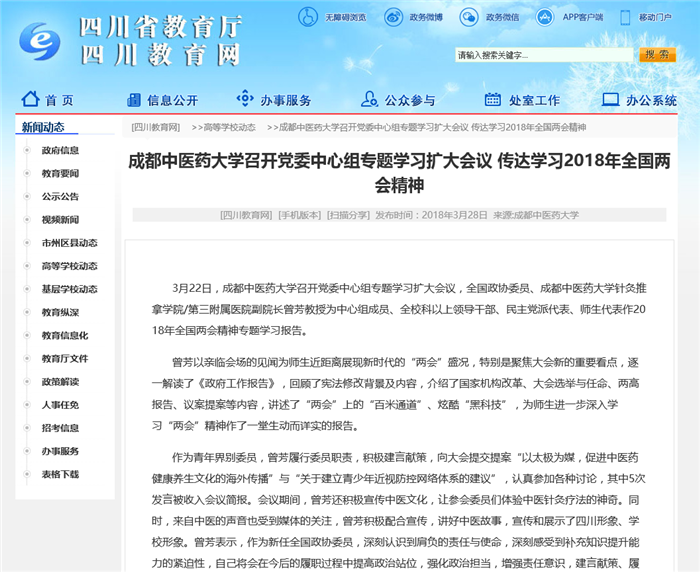 3月22日,beat365平台唯一官网召开党委中心组专题学习扩大会议,全国政协委员、beat365平台唯一官网针灸推拿学院/第三附属医院副院长曾芳教授为中心组成员、全校科以上领导干部、民主党派代表、师生代表作2018年全国两会精神专题学习报告。