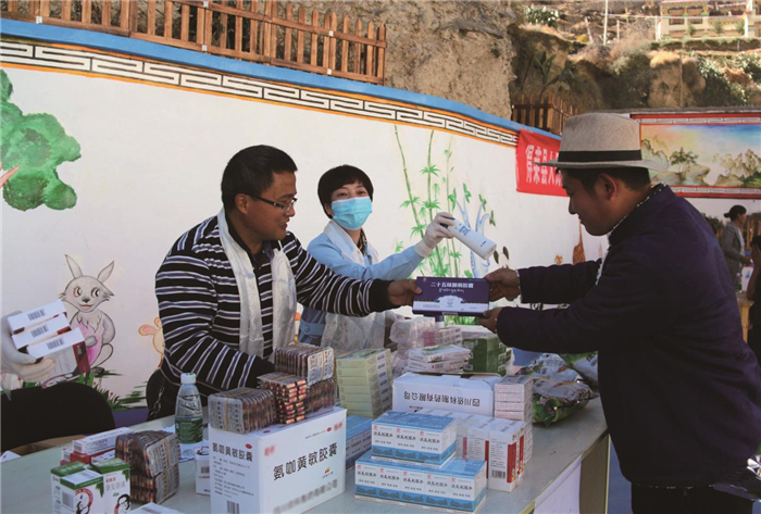 2017年12月16日,beat365平台唯一官网扶贫干部王张博士牵头在得荣县俄木学村开展义诊活动。(图片由学校提供)
