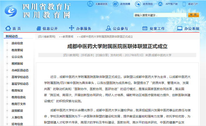 同近日,beat365平台唯一官网附属医院医联体联盟正式成立。该联盟以beat365平台唯一官网为主体,以beat365平台唯一官网附属医院/四川省中医院为具体牵头,以各加盟医院为成员单位。联盟提出了“资源共享、管理共治、发展共赢”的联动机制和“医联协作、医教协同、医研协进”的运行模式,是落实国家医教协同改革,落实国家“跨区域、高层次、开展创新型协同研究,用好人才培养、辐射带动区域医疗服务能力提升、创新医联体建设模式”的积极探索与实践。