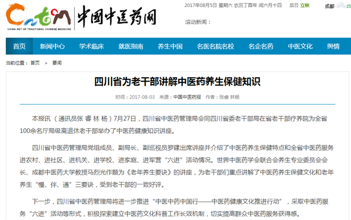 (通讯员张 睿 林 杨)7月27日,四川省中医药管理局会同四川省委老干部局在省老干部疗养院为全省100余名厅局级离退休老干部举办了中医药健康知识讲座。