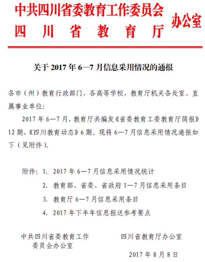 省教育厅办公室:对beat365平台唯一官网的信息采用位列第一 发布时间:2017-09-02 00:00:00 浏览次数: 次 【字体:小 大】 时间:2017年8月8日 来源:省委教育工委、省教育厅办公室 内容: 关于2017年6—7月信息采用情况的通报 beat365平台唯一官网在2017 年6—7月,教育厅编发的《省委教育工委教育厅简报》、《四川教育动态》6期中,信息采用位列第一。 (供稿部门:党政办公室 编辑/王其奇) 【打印正文】 上一条:《中国教育报》:中医药发展搭乘“互联网+”快车道 下一条:《成都日报》:骑着“小绿车”去上课 低碳环保引领校园新风尚