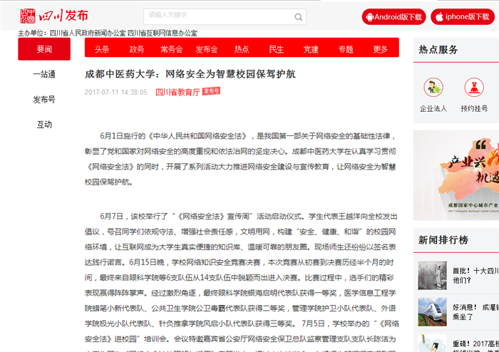 6月7日,该校举行了“《网络安全法》宣传周”活动启动仪式。学生代表王越洋向全校发出倡议,号召同学们依规守法、增强社会责任感,文明用网,构建“安全、健康、和谐”的校园网络环境,让互联网成为大学生真实便捷的知识库、温暖可靠的朋友圈。现场师生还纷纷以签名表达践行诺言。6月15日晚,学校网络知识安全竞赛决赛,本次竞赛从初赛到决赛历经半个月的时间,最终来自眼科学院等6支队伍从14支队伍中脱颖而出进入决赛。比赛过程中,选手们的精彩表现赢得阵阵掌声。经过激烈角逐,最终眼科学院银海启明代表队获得一等奖,医学信息工程学院蜡笔小新代表队、公共卫生学院公卫毒霸代表队获得二等奖,管理学院护卫小队代表队、外语学院极光小队代表队、针灸推拿学院风启小队代表队获得三等奖。 7月5日,学校举办的“《网络安全法》进校园”培训会。会议特邀嘉宾省公安厅网络安全保卫总队监察管理支队支队长陈洁为大家作题为《网络安全法的理解与适用》专题讲座。通过本次培训会,在场师生都深深意识到网络安全的重要性,每一个人都应自觉成为网络安全的守护者。维护网络安全是全社会共同责任,需要政府、企业、社会组织、广大网民共同参与,共筑网络安全防线。