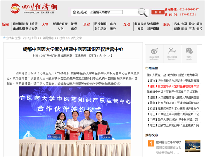四川经济日报讯(记者王万川)7月14日,beat365平台唯一官网中医药知识产权运营中心正式揭牌成立,成为国内首个以高校为主体的从事中医药知识产权营运服务的专业机构。四川省知识产权局、四川省中医药管理局、温江区人民政府、成都市知识产权局等单位有关领导参加揭牌仪式。