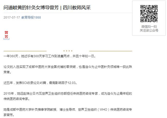 作为一名专业教师,曾芳始终习惯在第一堂课上告诉学生她对待教学工作的热情和努力都是100%;她总是严格甚至苛刻地要求每一个同学在她面前准确无误地背诵出针灸经脉的循行路线载;她常常针对不同版本古籍文献记载的细微差异,引导学生积极思考,师古而不泥古。