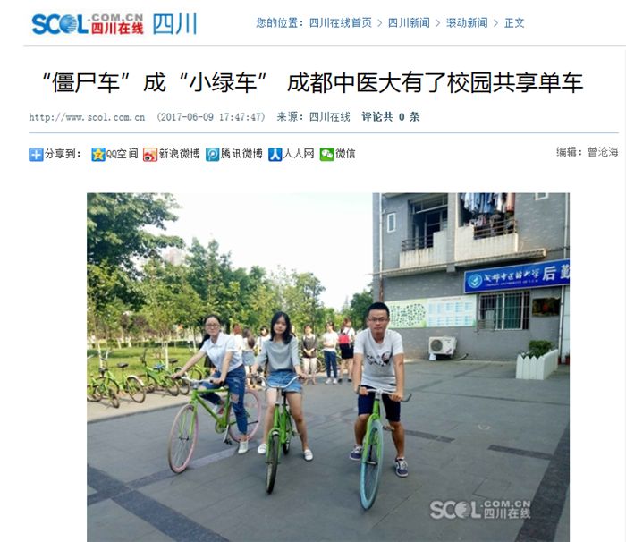 “僵尸车”成“小绿车” 成都中医大有了校园共享单车